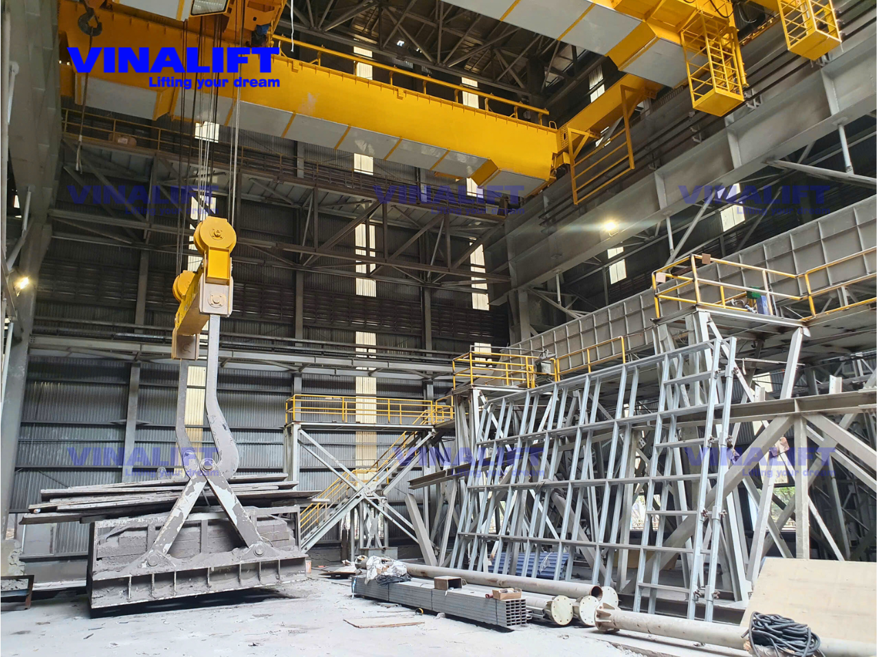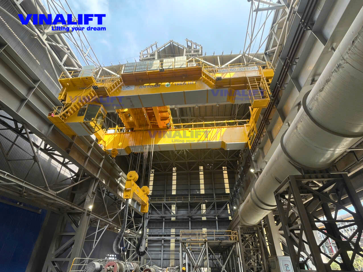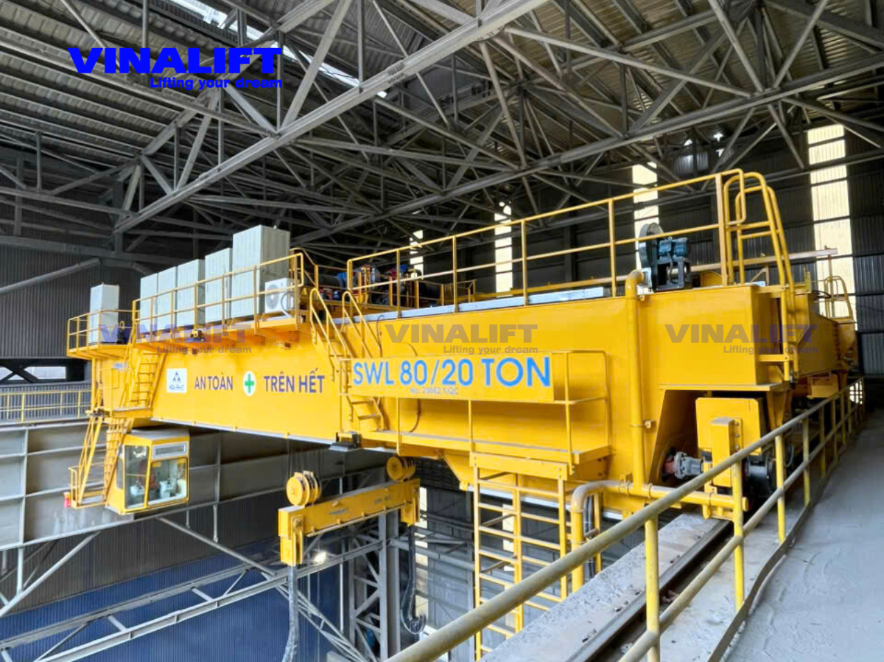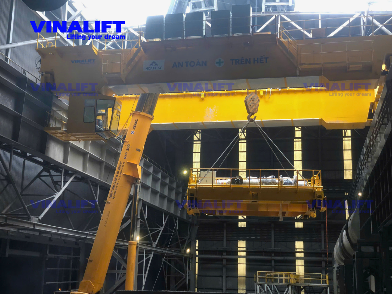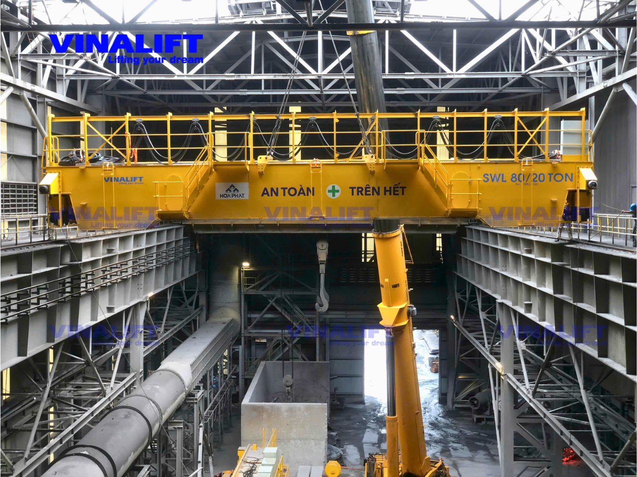 Hệ thống cầu trục dầm đôi 80/20 tấn do VINALIFT chế tạo được lắp ráp và vận hành tại Gian MN ủ xỉ mở rộng, nhà máy HRC1 thuộc Khu liên hợp sản xuất gang thép Hòa Phát Dung Quất.
