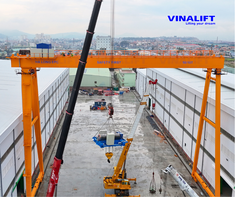 Cổng trục dầm đôi 50/10 tấn là giải pháp thiết bị nâng hạ hạng nặng được VINALIFT thiết kế và chế tạo dành riêng cho các bãi tổ hợp kết cấu thép quy mô lớn. Với khẩu độ lên tới 40m và hành trình di chuyển dài 160m, hệ thống không chỉ đáp ứng công năng bốc dỡ các kiện hàng siêu trường, siêu trọng mà còn đảm bảo sự bền bỉ tuyệt đối trong môi trường ngoài trời.
